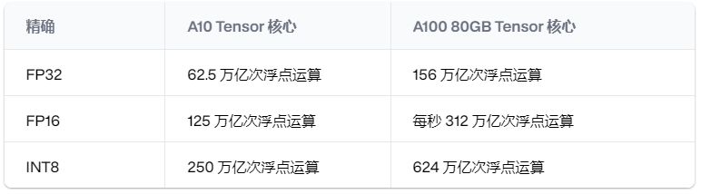 精度越低,FLOPS 數量越高。例如,以下是 A10 和 A100 GPU 在不同精度下的計算能力比較。