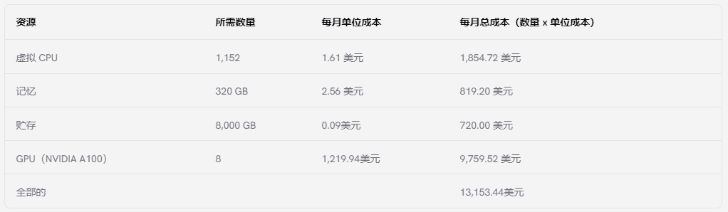 使用捷智算平臺上 A100 GPU 的中位數(shù)價格,以下是每種所需資源的成本: