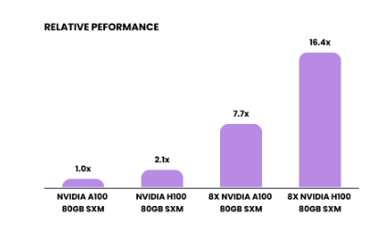 LambaLabs 嘗試使用 FlashAttention2 訓練大型語言模型(具有 175B 個參數的類 GPT3 模型)對兩種 GPU 進行基準測試時,獲得的改進較少。在這種情況下,H100 的性能比 A100 高出約 2.1 倍。