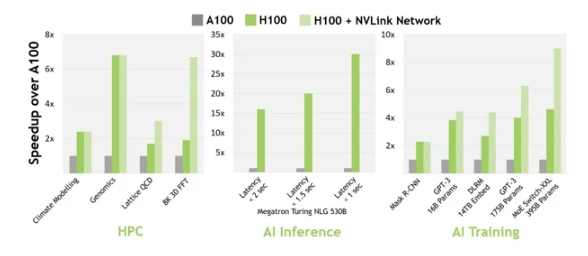 據 NVIDIA 介紹,H100 的推理性能最高可提高 30 倍,訓練性能最高可提高 9 倍。這得益于更高的 GPU 內存帶寬、升級的 NVLink(帶寬高達 900 GB/s)和更高的計算性能,H100 的每秒浮點運算次數 (FLOPS) 比 A100 高出 3 倍以上。