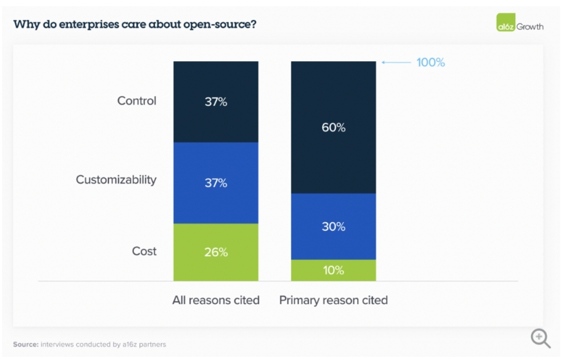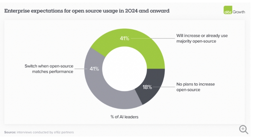 最近的報告顯示,人們對開源大型語言模型的偏好日益增長。根據 a16z.com 數據顯示,41% 的受訪企業計劃增加對開源模型的使用,而非封閉模型。另有 41% 的企業表示,如果其性能與封閉模型相當,則會轉向開源模型,而只有 18% 的企業不打算增加對開源 LLM 的使用。