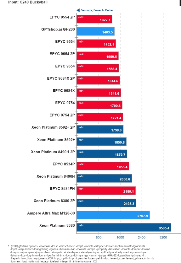 另一個重要的結果來自NWChem 基準測試,GH200 以 1403.5 秒的成績獲得第二名。