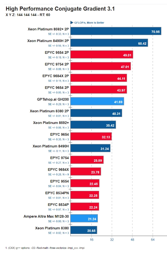 GH200 Grace CPU 在標準HPCG 內存帶寬基準測試中實現了 41.7 GFLOPS 。
