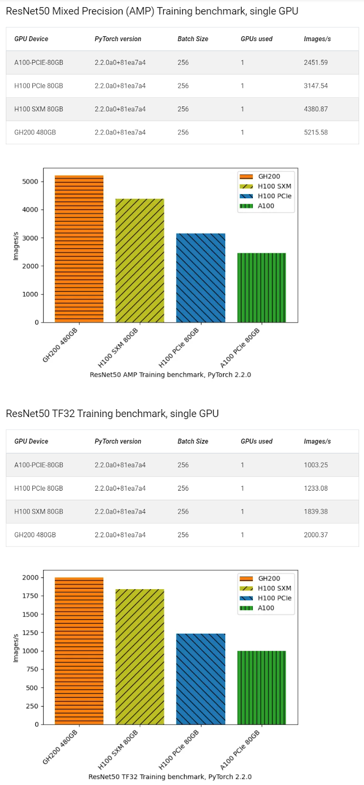 研究員 Simon Butcher進行了一系列 GPU 基準測試,比較了NVIDIA 發布的PyTorch ResNet50 訓練方案的性能。使用 150GB ImageNet 2012 數據集,訓練運行了 90 個 epoch,大約一個小時。GH200 在這些測試中表現出色。