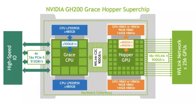 GH200 的架構樹立了新的高性能計算 (HPC) 標準。它將先進的 Hopper GPU 和靈活的 Grace CPU 集成到單個超級芯片中,并通過高速、內存一致的NVIDIA NVLink Chip-2-Chip (C2C) 互連進行連接。