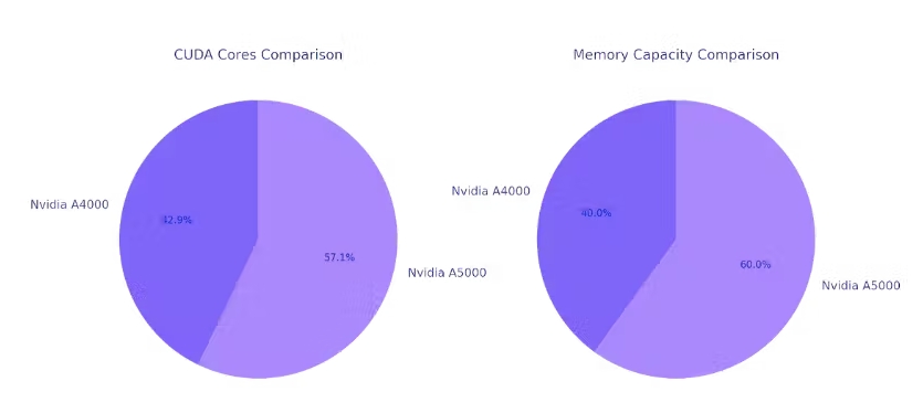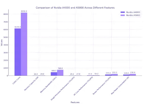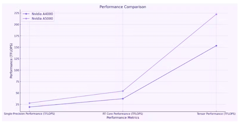 與 A4000(37.4 TFLOPS)相比,A5000 還具有卓越的 RT Core 性能(54.2 TFLOPS),表明光線追蹤能力更佳。
