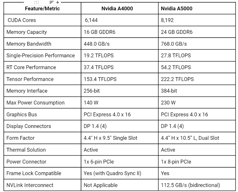 兩款 GPU 均配備四個(gè) DP 1.4 顯示連接器,但 A5000 的外形尺寸更大,需要更強(qiáng)大的電源連接器(1 個(gè) 8 針 PCIe,而 A4000 為 1 個(gè) 6 針 PCIe)。雖然兩款 GPU 都兼容幀鎖,但只有 A5000 支持 NVLink Interconnect,提供 112.5 GB/s(雙向)的速度。