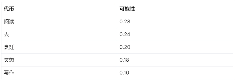 對于 top-p 抽樣,如果該值設(shè)置為 0.6,則會包括“閱讀”和“去”,因為它們的組合概率為 0.52(0.28 + 0.24)。包括“烹飪”將使累積概率為 0.72(0.28 + 0.24 + 0.20),這超過了閾值,因此排除了“烹飪”、“冥想”和“寫作”。